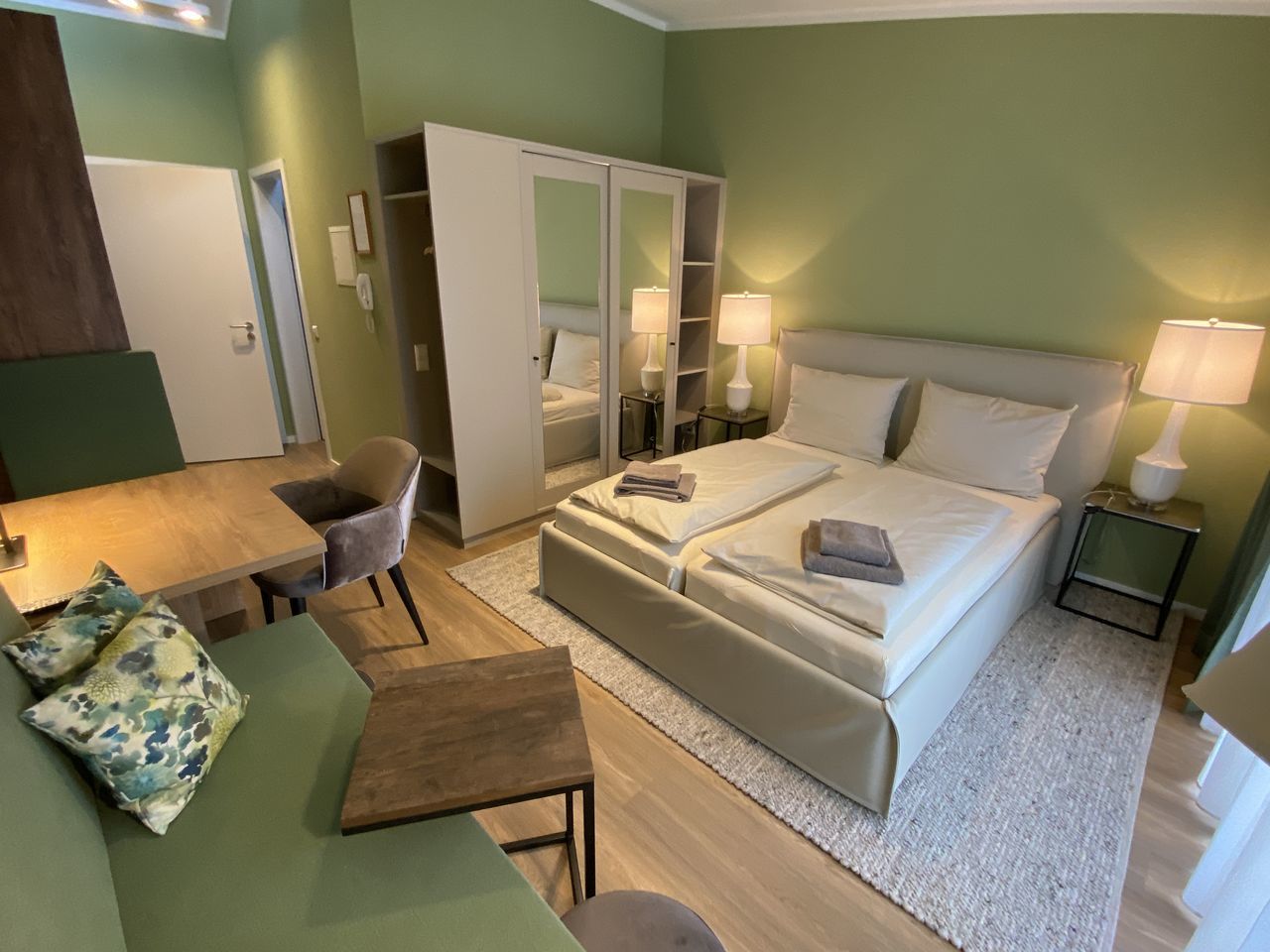 - Wohn- & Schlafraum: Sessel, Tisch mit 2 Stühlen, Sat-TV, Doppelbett mit 2 Nachttischen, Kleiderschrank und Bettwäsche
