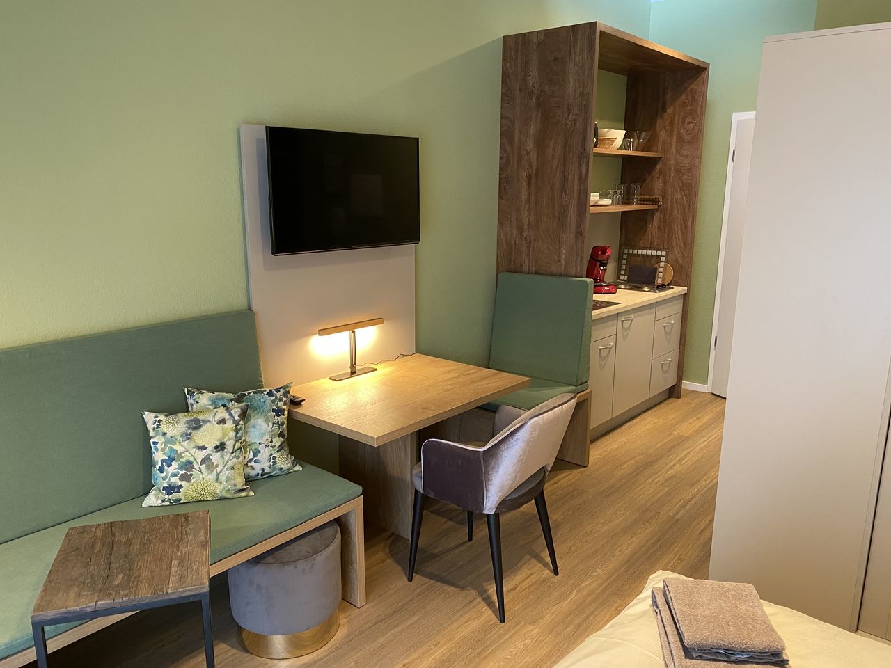 - Kochgelegenheit: 2-Plattenherd mit Spüle, Kaffeemaschine (Kombi Pad & Filter), Wasserkocher und Toaster, Geschirr für 2 Personen