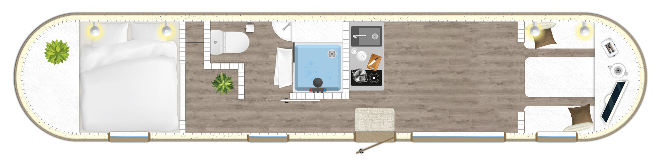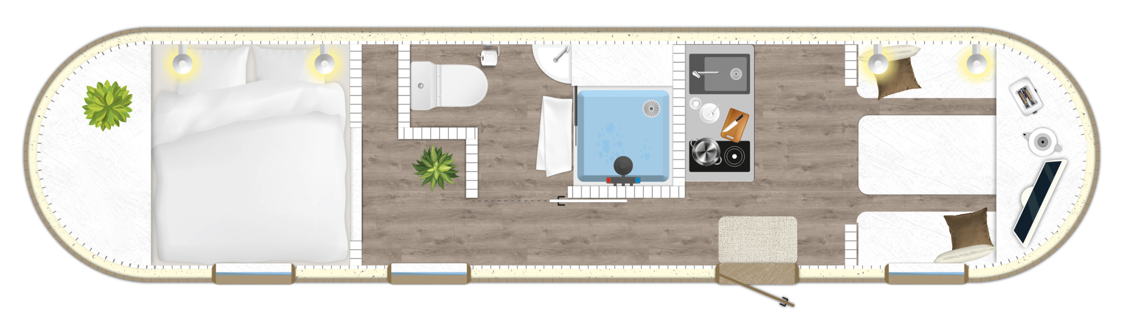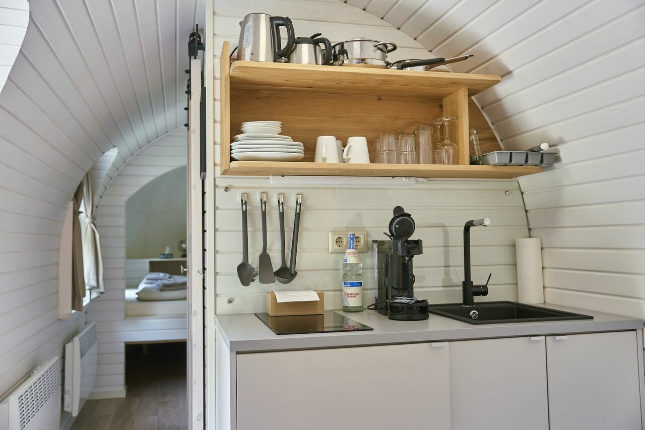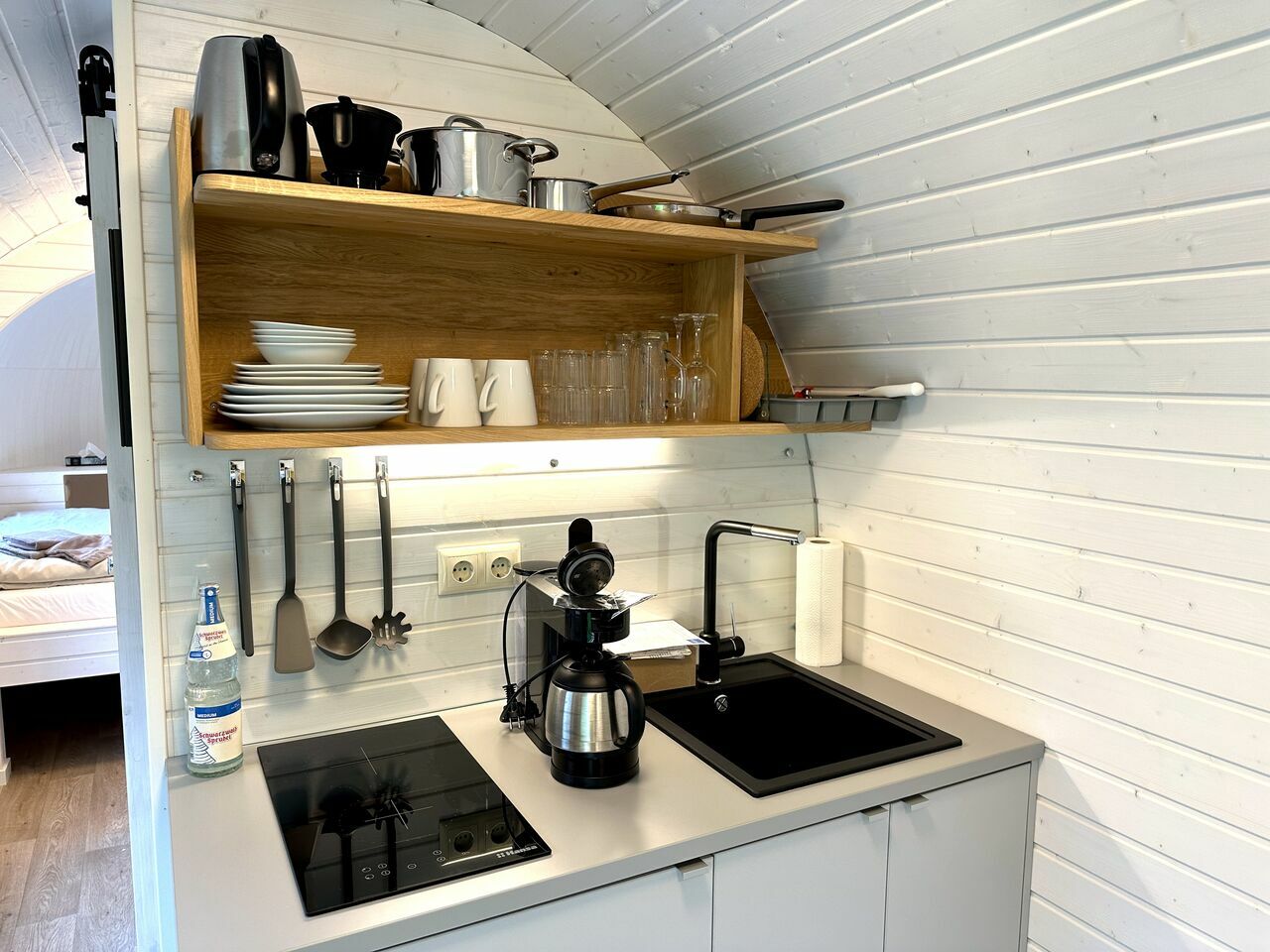 - Küche: Eine kleine Küchenzeile mit Spülbecken und Doppelkochplatte bietet die Möglichkeit ein Frühstück oder eine kleine Mahlzeit zu zubereiten. Ein geräumiger Kühlschrank unter der Kochplatte bietet Platz für frische Waren und kalte Getränke.