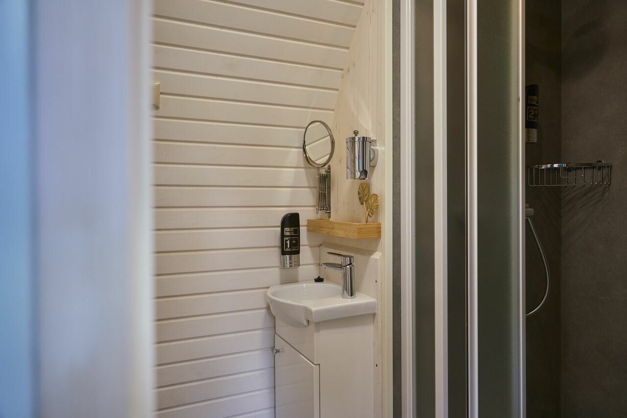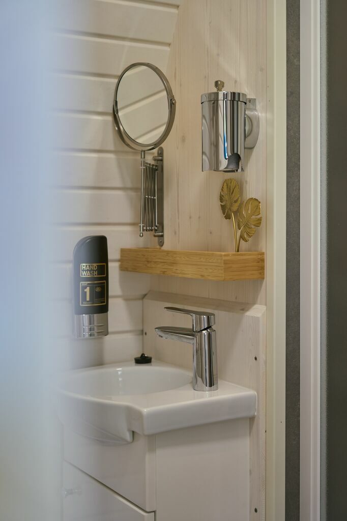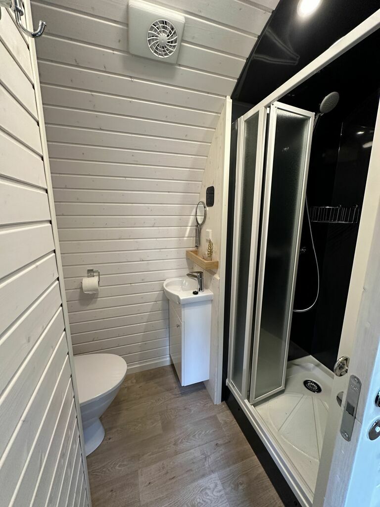 - Badezimmer: Hinter der Schiebetür befindet sich ein Badezimmer mit Dusche, Waschplatz und Toilette.