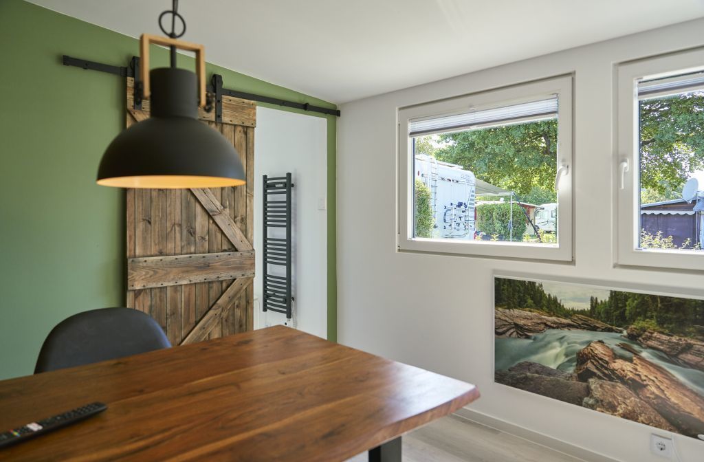 - Waschraum mit haushaltsüblicher Keramik-Hängetoilette (Anschluss an das Abwassersystem, kein Chemie-WC!))