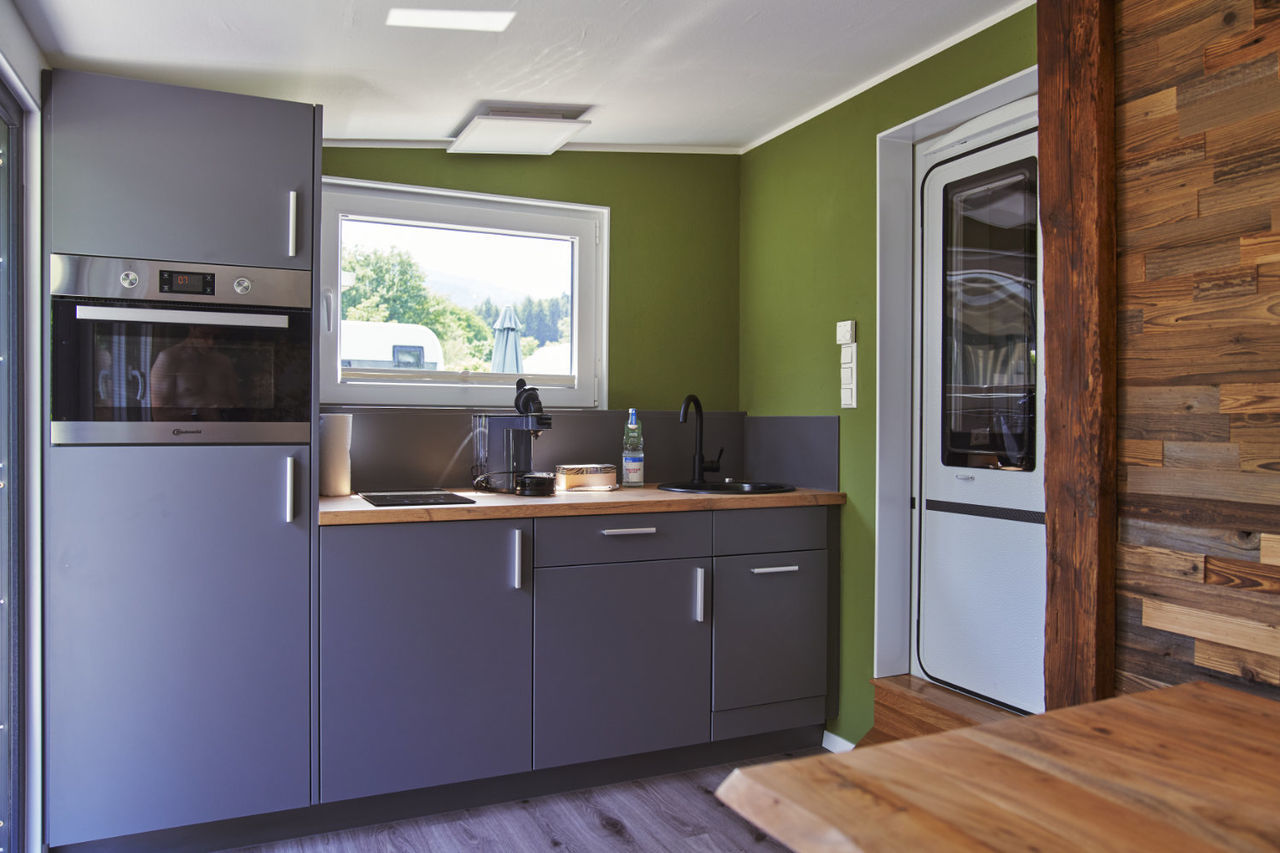 - modern ausgebautem Vorzelt : mit vollwertige Küche mit Zwei-Platten-Herd, Spüle, Kühlschrank und Herd-/Mikrowellenkombination