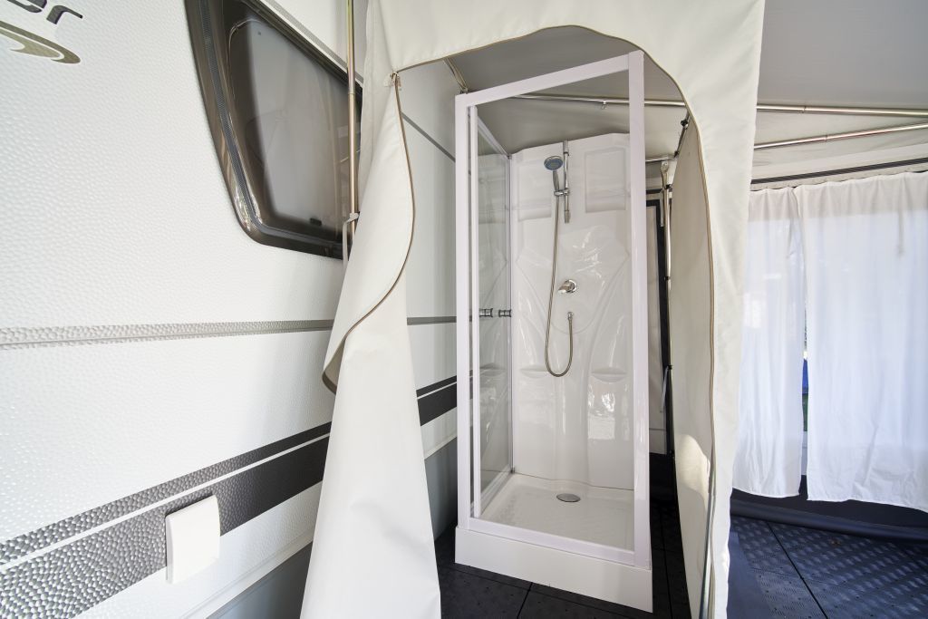 - normales Vorzelt mit Trinkwasseranschluss und Duschkabine mit separater Abtrennung